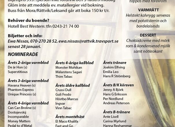 Vi har sju nomineringar till trav galan som går av stapeln den 1 februari. Hoppas att så många som möjligt kan vara med och heja fram våra fyrbenta och tvåbenta aspiranter. Om/när ni anmäler er [...]
